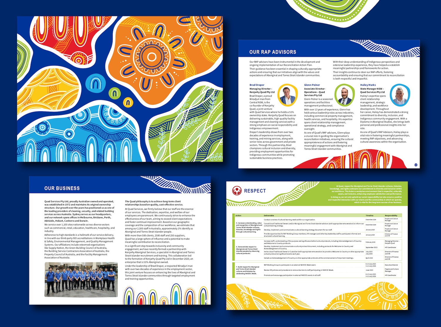Quad were looking for both artwork and graphic design services for their new Reconciliation Action Plan (RAP). They were looking for a clean and simple design to complement their partnership with Kenjarhy Aboriginal Services.