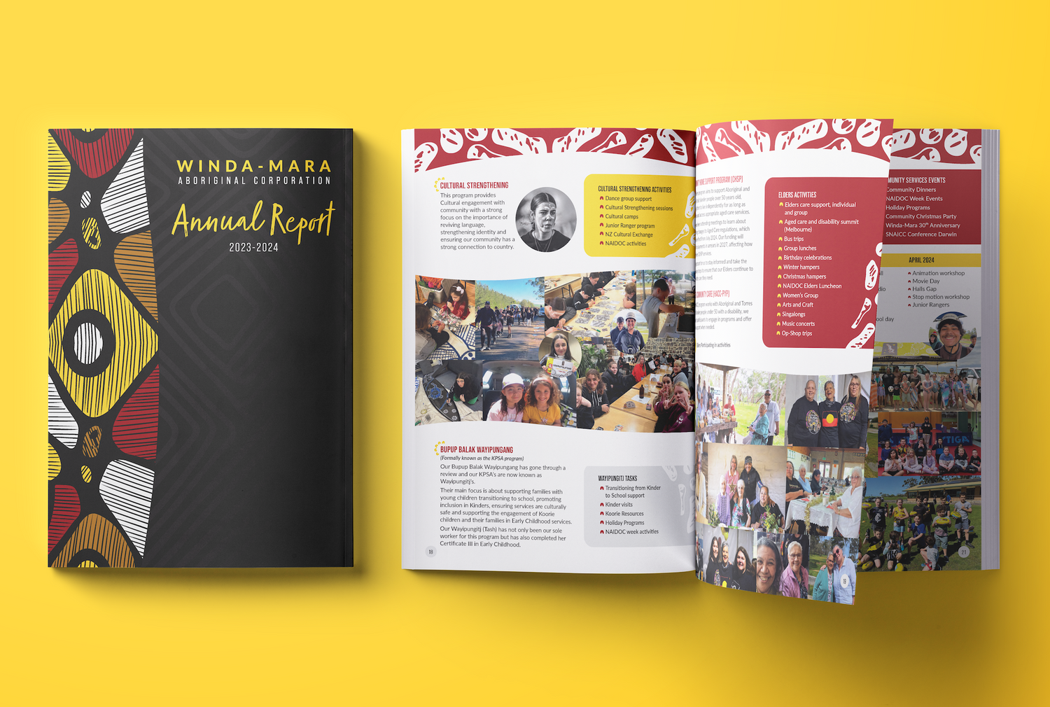 Winda-Mara were looking for a colourful and fun Annual Report design that included patterns from their possum skin cloak from their logo and a professional yet cultural design.
